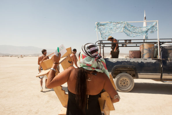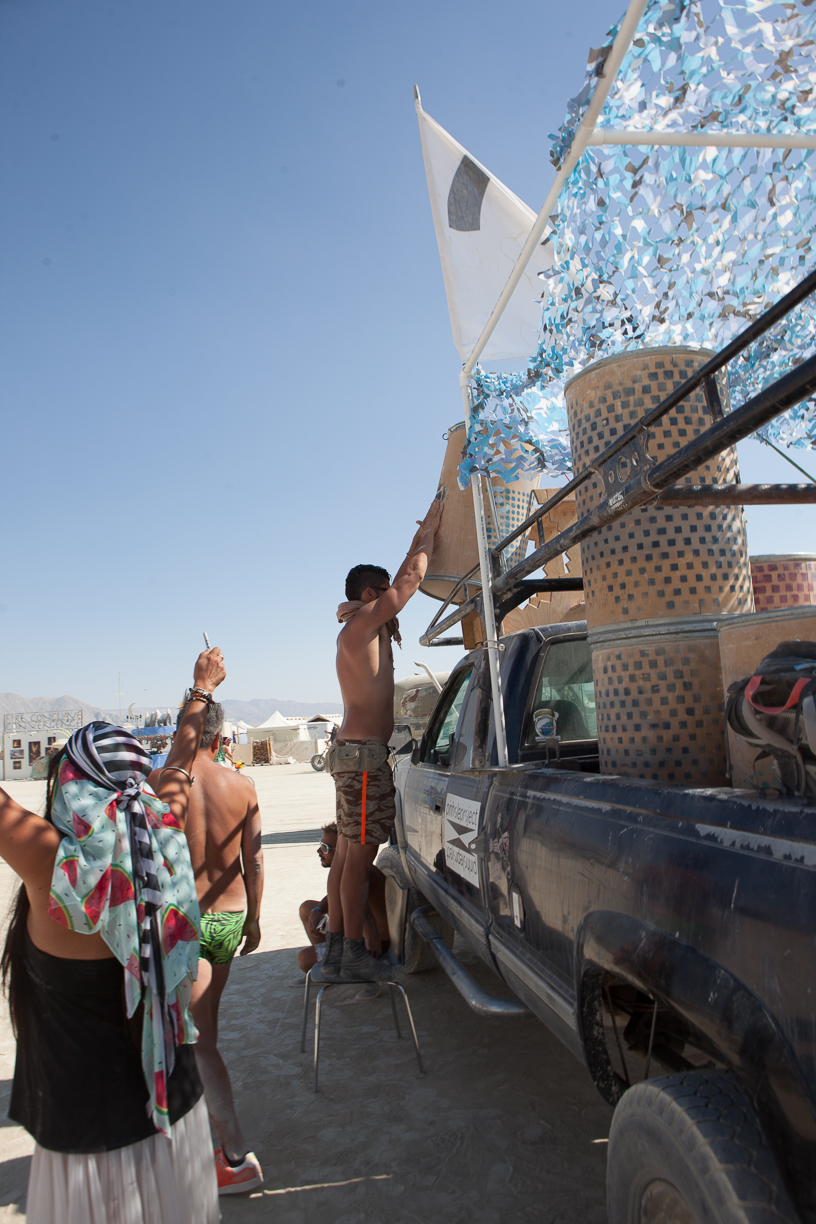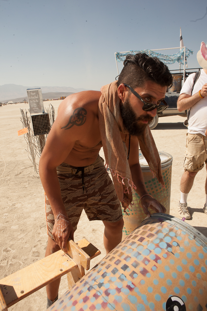 The 55 gallon drums are the cameras, and the paper inside inside is developed in a darkroom on at Black Rock City. The big wooden structures are to secure the cameras during the long exposure times. You will note some people using the Pinhole Master app on their phones to help with timing the shots.